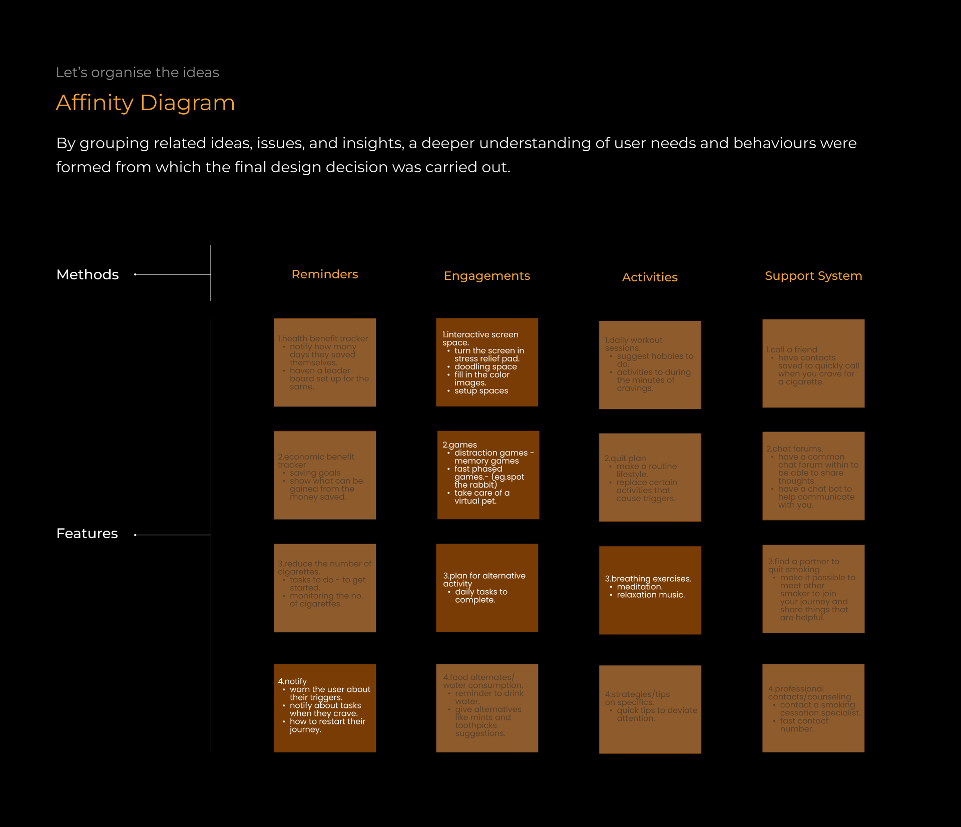 The goal of the project was to create a behavioral change solution to support individuals in their efforts to quit smoking. The design primarily focuses on tracking triggers and employing distraction techniques.